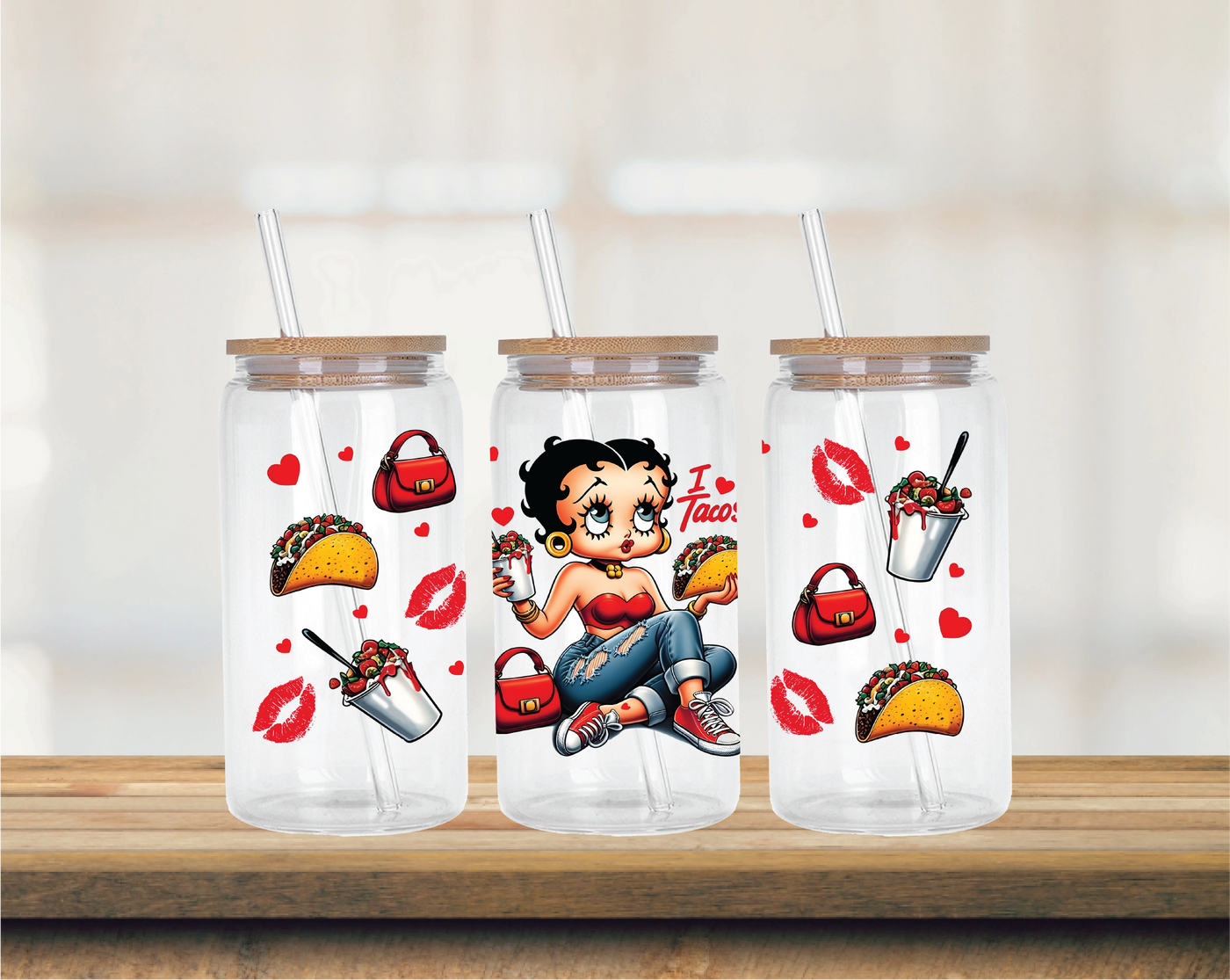 Elevate your beverage experience with this premium 16oz glass can, expertly crafted for both functionality and style. The crystal-clear borosilicate glass showcases your favorite drinks while maintaining optimal temperature control. Featuring a sustainable bamboo lid that seals securely and an included reusable straw, this eco-conscious vessel reduces single-use waste without compromising convenience. The charming In Betty Boop I love Tacos design adds personality to your daily routine, making it an ideal companion for coffee, smoothies, iced tea, or any beverage of choice. Durable and built to last, this glass can combines environmental responsibility with sophisticated everyday utility.