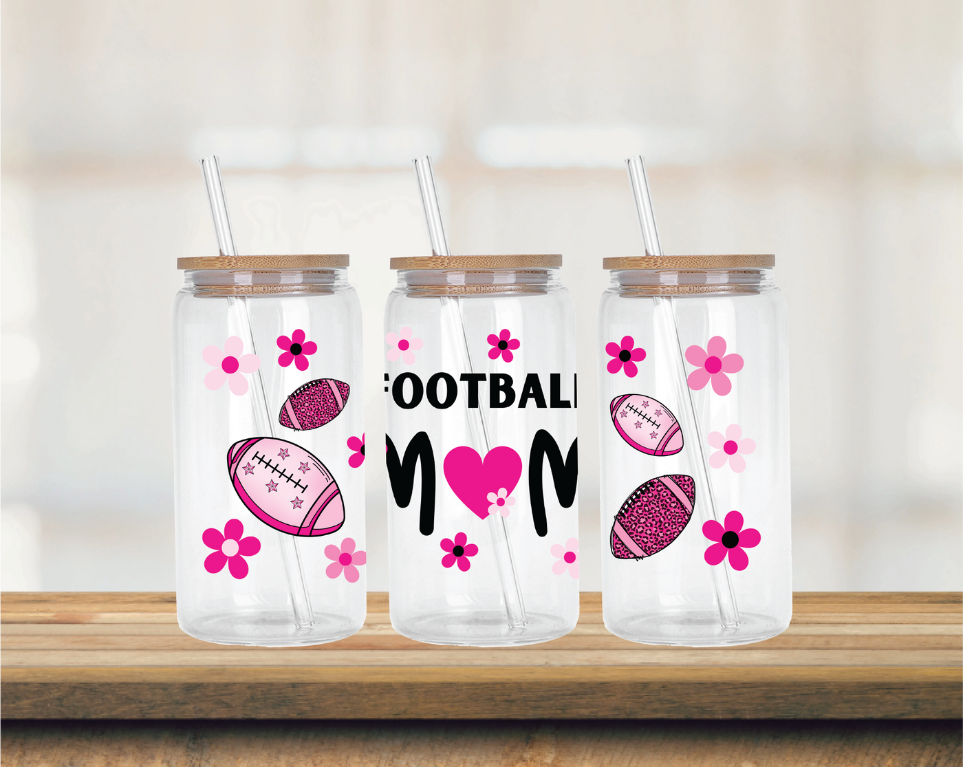 Elevate your beverage experience with this premium 16oz glass can, expertly crafted for both functionality and style. The crystal-clear borosilicate glass showcases your favorite drinks while maintaining optimal temperature control. Featuring a sustainable bamboo lid that seals securely and an included reusable straw, this eco-conscious vessel reduces single-use waste without compromising convenience. The charming Football Mom design adds personality to your daily routine, making it an ideal companion for coffee, smoothies, iced tea, or any beverage of choice. Durable, and built to last, this glass can combines environmental responsibility with sophisticated everyday utility. Handwash Only
